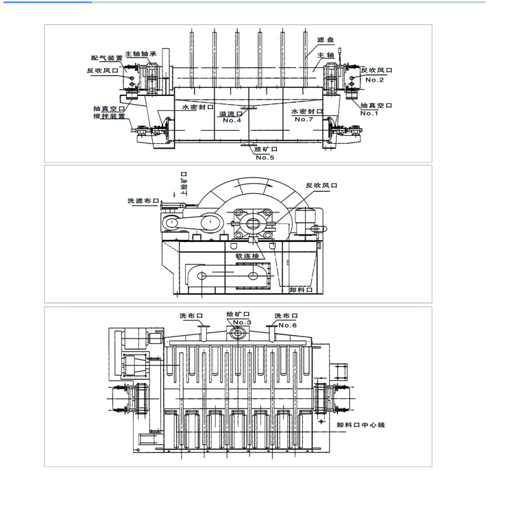 PG系列盤式真空過濾機 (1)扇形濾板脫水孔分布均勻,孔率合理,筋條尺寸大,由高強度工程塑料制成,壽命提高了2-3倍。 (2)濾液管過濾數(shù)面大,分配頭腹腔容積大,提高了抽氣率和濾液排放效果。 (3)耐磨錦綸、單或復絲濾布使脫餅率高且不易堵塞,使用壽命長。 (4)多點干油泵集中多點自動潤滑。 (5)濾布自動清洗裝置,保持了其良好的脫水效果。 (6)臥式強制高速攪拌、軸端采用橡膠及石墨盤根和水壓差三重密封不漏漿。 (7)主傳動無級變速,依物料的濃度及流量調(diào)節(jié)(交流調(diào)速電機或變頻器),以求達到理想的工作效果 。 (8)每盤由20片扇形板組成,加強了過濾過程控制,成餅厚度均勻。 (9)磨擦片采用特制耐磨硼鑄鐵,剛?cè)嵯酀芊饧?,使用壽命達到十年以上。 (10)濾液管為高強度耐磨陶瓷復合鋼管,提高壽命10倍以上。 (11)濾液管與濾扇接口去掉下法蘭,采取模具定位直接焊接,減少了90%可能的漏氣點。